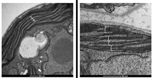 Trasmission electron microscopy of wt (A) and ATPase b subunit expressing (B) chloroplasts. Image suggest that in B the expression of subB alters the thylakoid organisation