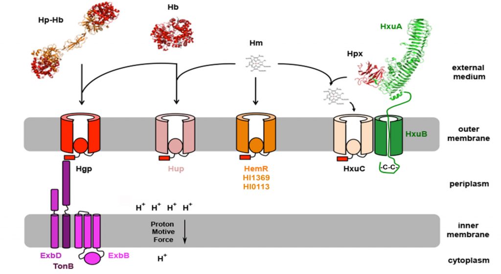 Like other Gram negative bacteria, Hi rely on outer membrane proteins belonging to the TonB Dependent Transporter (TBDT) family to import heme form the host hemoproteins.4 However, the precise molecular mechanism of heme import has not been deciphered yet.