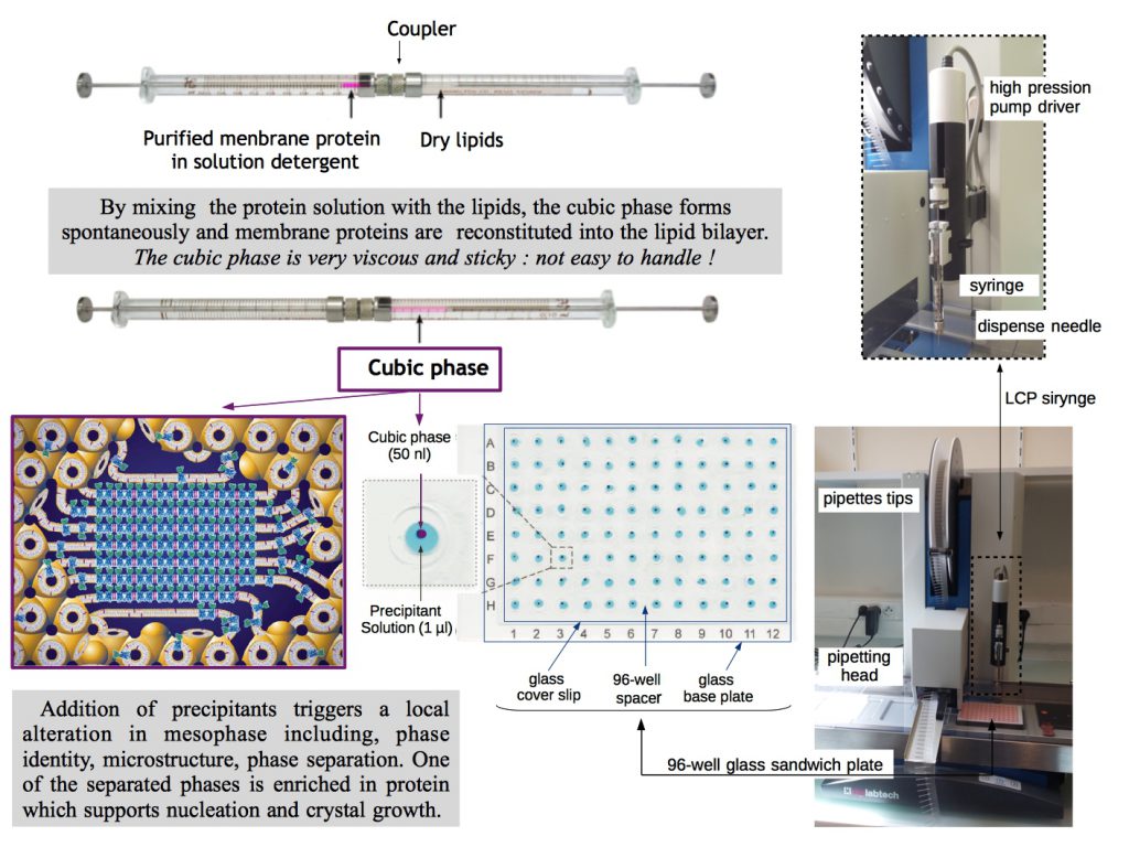 The crystallization in presence of antagonists is then performed using the lipid cubic phase (LCP) or in meso method [4]. LCP is a highly viscous bicontinous lipidic liquid crystalline phase providing a more stable native-like membrane environment for crystallization of membrane proteins. This robust approach for crystallizing membrane proteins is lately under development in the laboratory thanks to the arrival of automatic mesophase dispensing robots making LCP crystallogenesis more accessible (figure 1b, crystallization platform link).