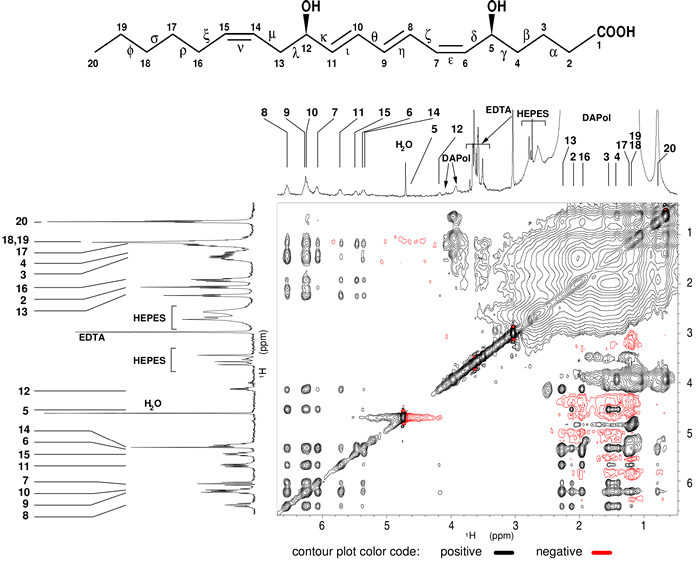 The corresponding 1D 1H spectrum is shown above the 2D spectrum. In order to help in the identification of cross-peaks, the 1D spectrum of free LTB4 in solution is displayed on the left side. Numbers refer to the protons annotated on the LTB4 chemical structure above the spectrum.